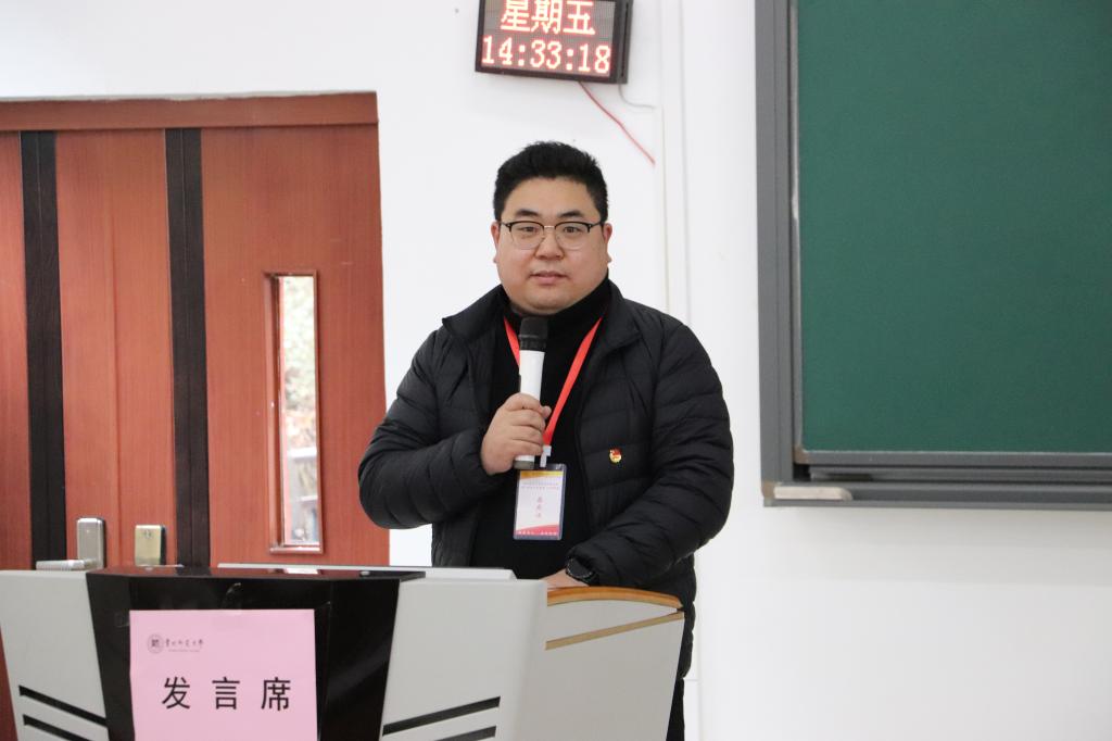 校团委副书记、校员工会研究生会秘书长李正军代表校团委对本次大会的召开表示祝贺,肯定公司团学工作的同时提出四点要求:一要强化创新理论武装,坚定四个自信,做到两个维护;二要围绕中心,服务大局。公司各级团委组织要争做走在时代前列的奋进者、开拓者、奉献者;三要密切联系,扩大团的有效覆盖,走进青年群体,弘扬“真善美”,批判“假恶丑”;四要坚持改革创新,不断加强自身建设。李老师最后强调,在座各位代表要以这次大会的召开为契机,牢记嘱托,感恩奋进,以更加昂扬的姿态,更加坚韧的意志,更加过硬的本领,在书写公司发展新篇章的新长征路上奋勇搏击,建功立业。