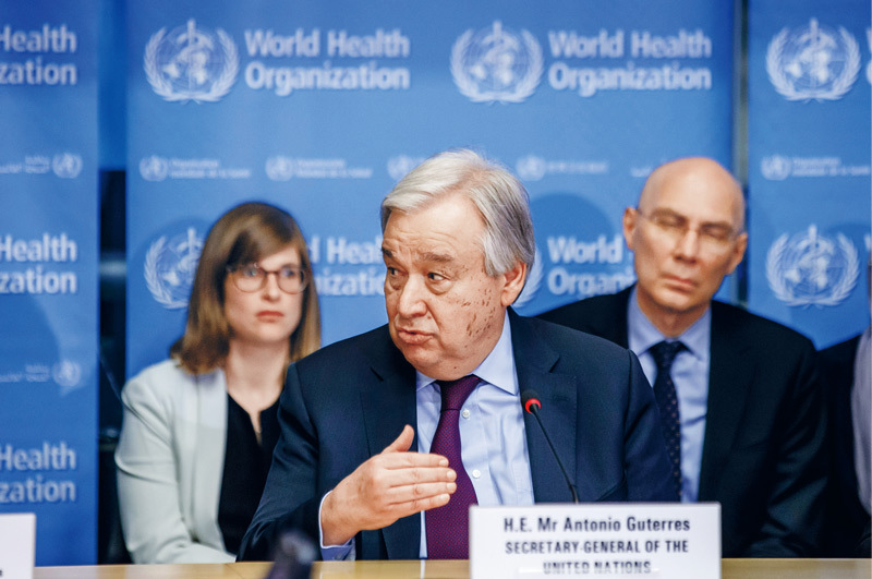 2020年2月24日,联合国秘书长古特雷斯(前)在瑞士日内瓦世界卫生组织总部发表讲话。古特雷斯表示,中国实施严格的防控措施,以牺牲正常生活的方式为全人类作出了贡献。古特雷斯当日造访日内瓦世卫组织总部,并与世卫组织各部门负责人举行座谈。 新华社发